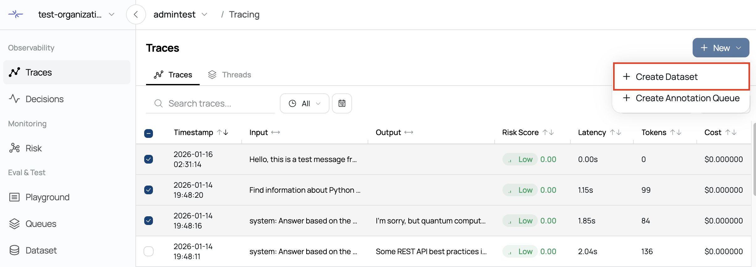 Click Create to add the selected traces as dataset items and navigate to the dataset detail page.