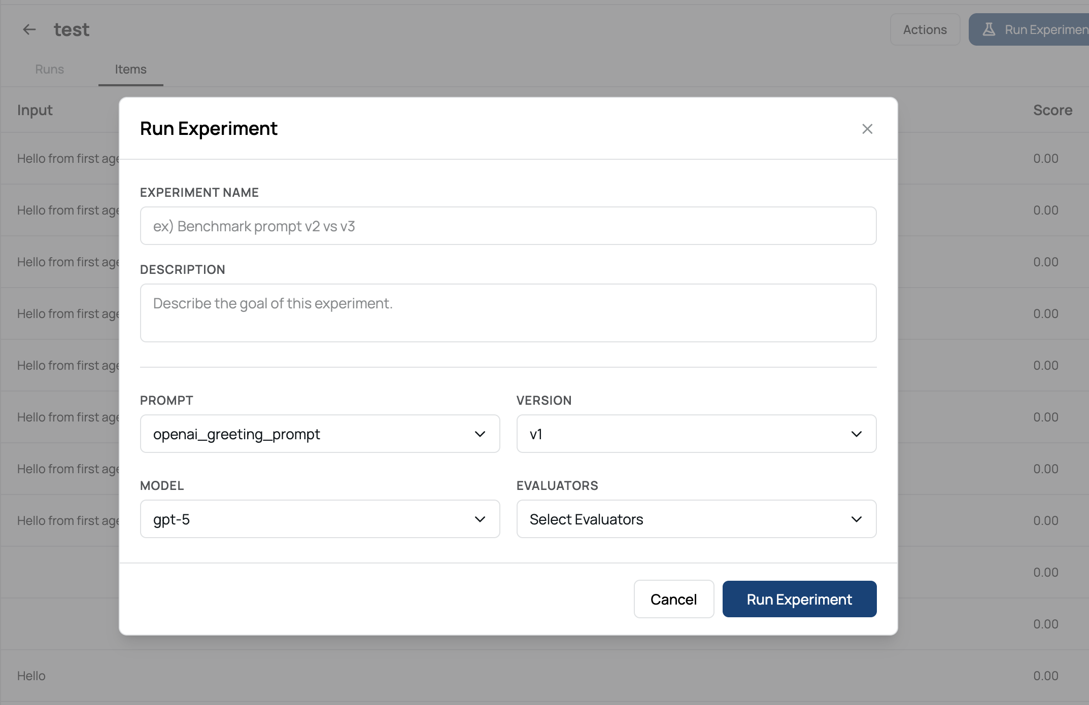 Select a prompt, model, and evaluator in the experiment settings.