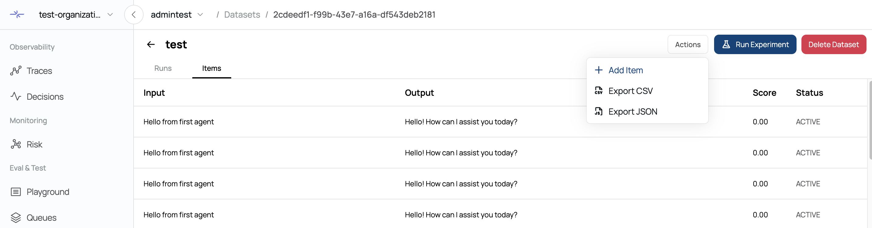 input,output,score, andstatusfor all items.The file name automatically includes the dataset name and export date.