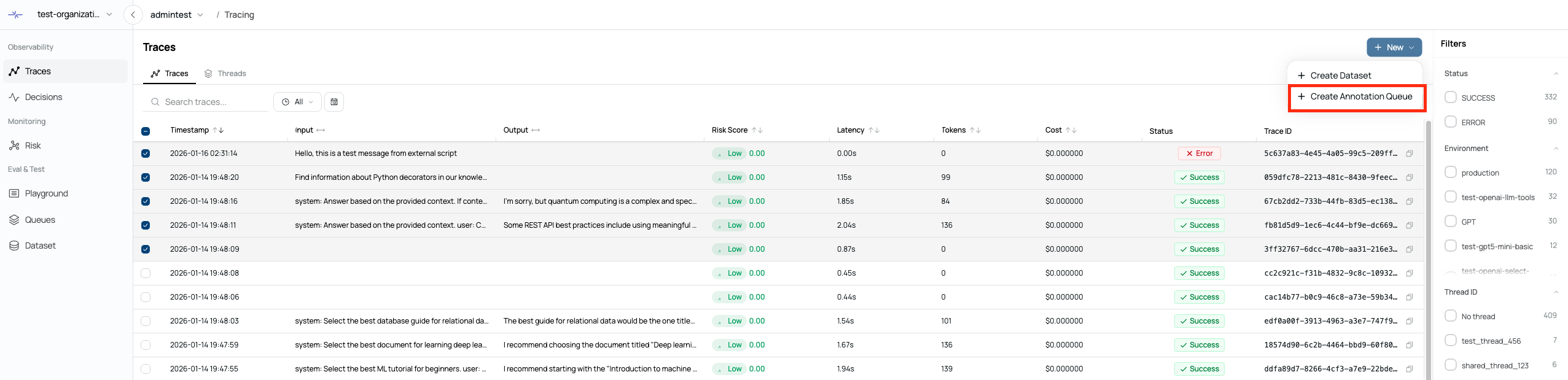 A Queue is a place where Human Evaluation or LLM Evaluation is performed.