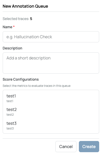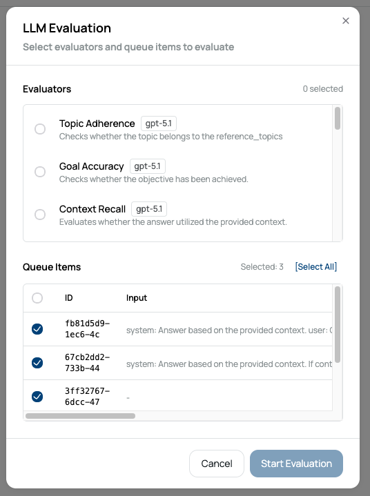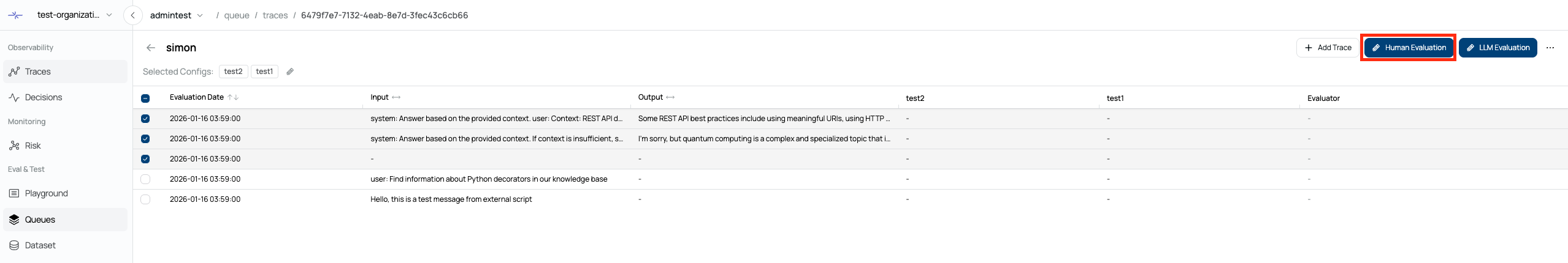 Using the predefined Score Configuration, a human evaluator can manually evaluate the selected trace or decision.