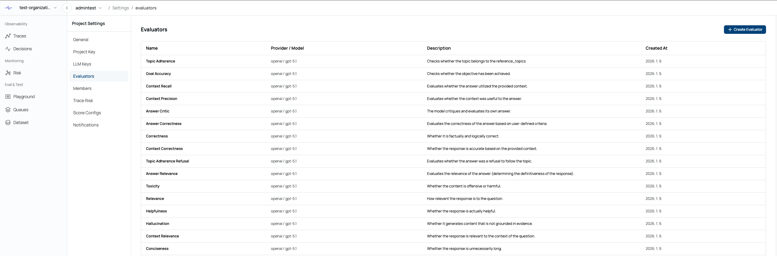 Additional LLM Evaluators can be added in Project Settings → Evaluators.