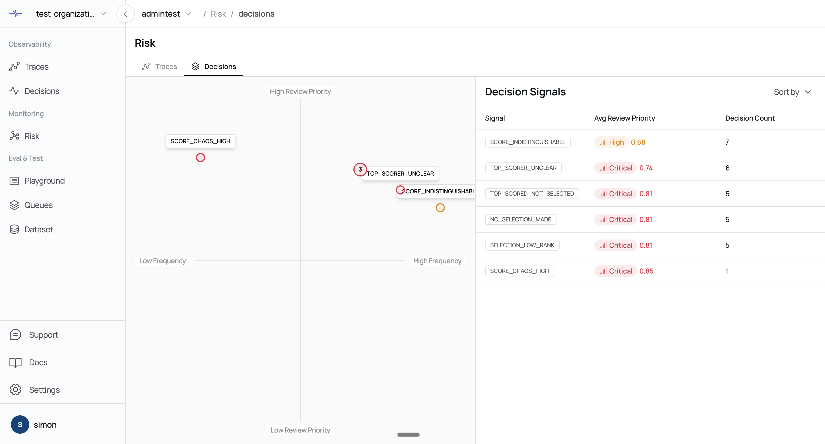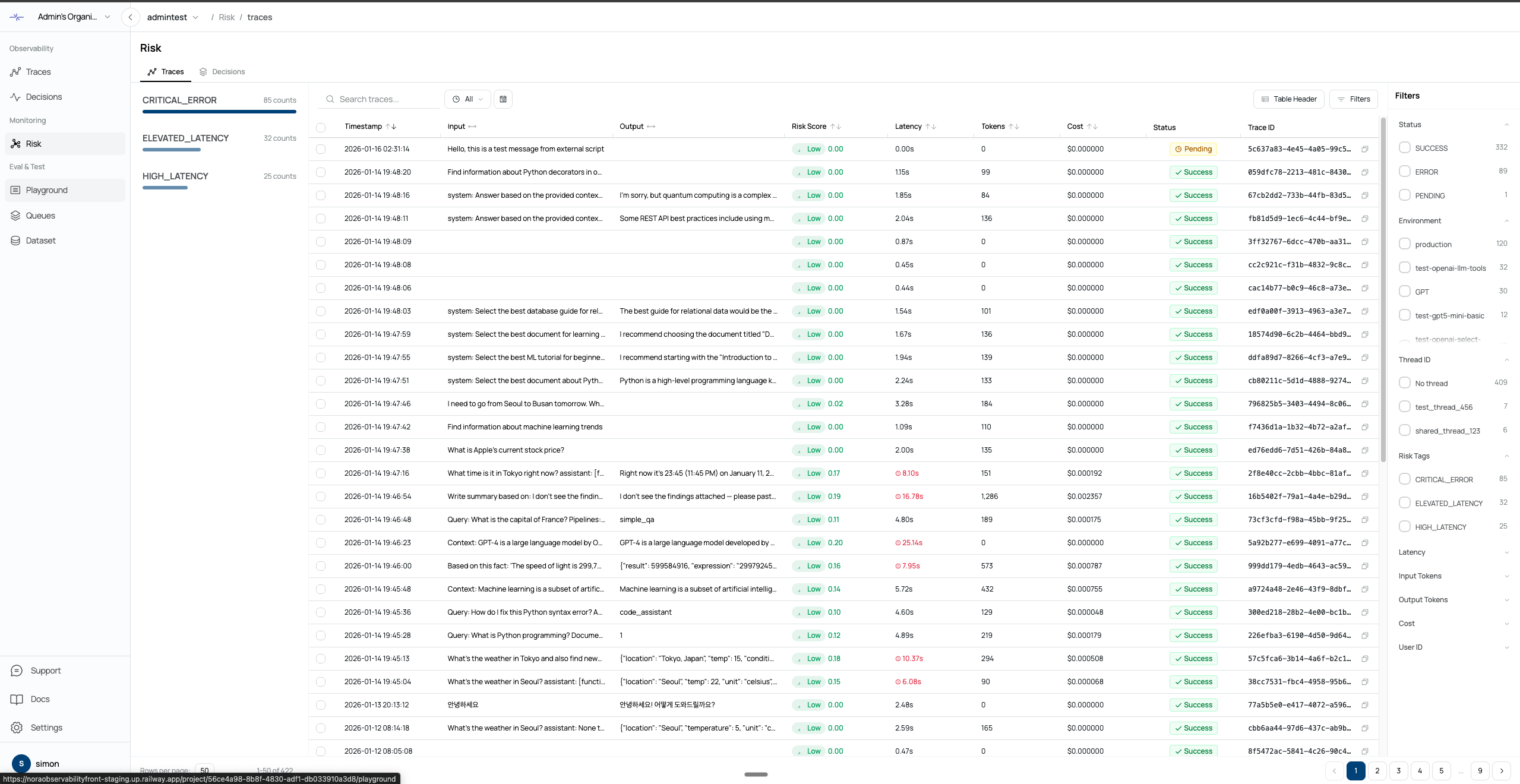 The Risk page provides functionality to systematically analyze and visualize risks that occur during LLM Traces and Decision processes.