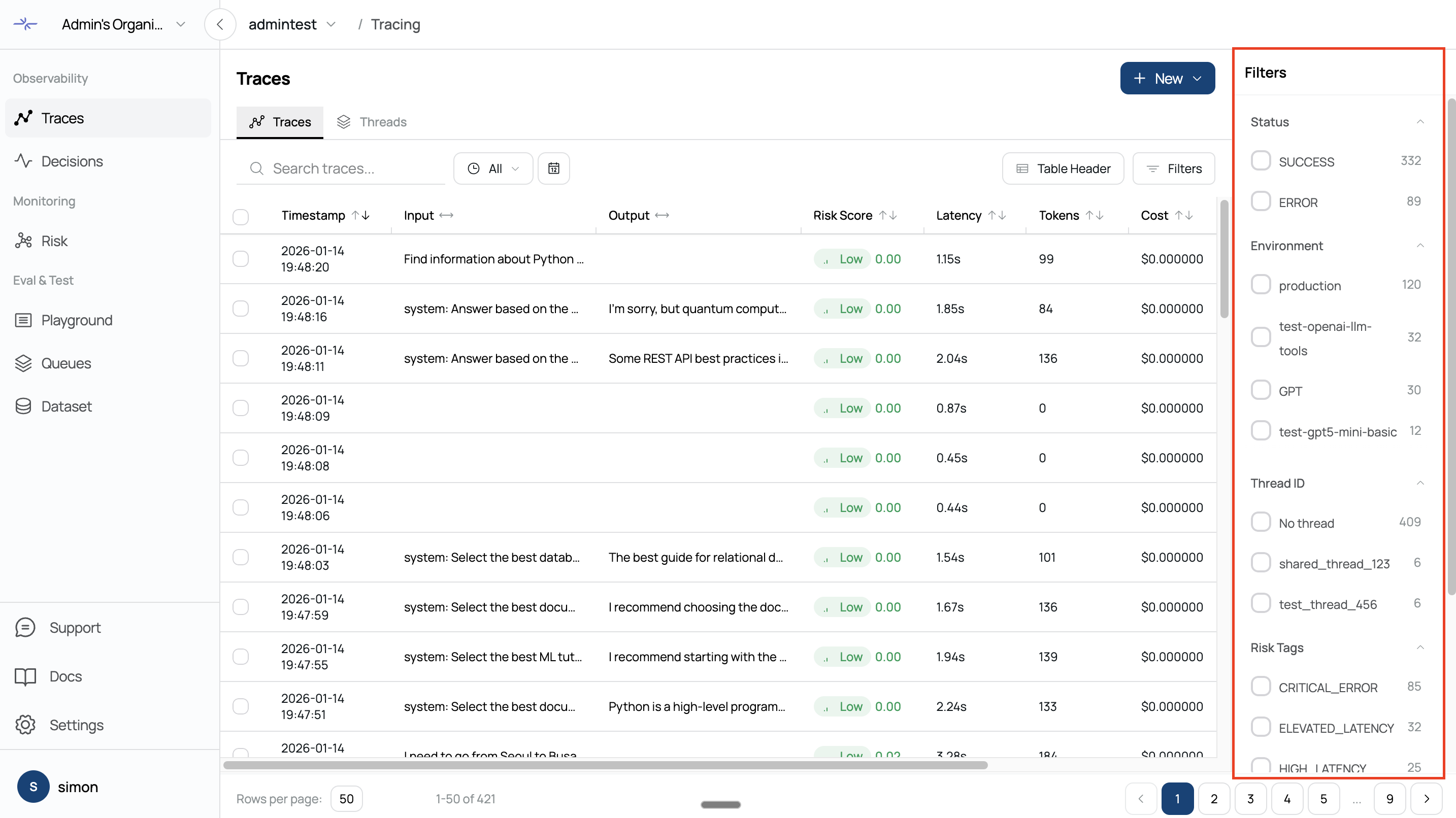 Filter traces by risk tag